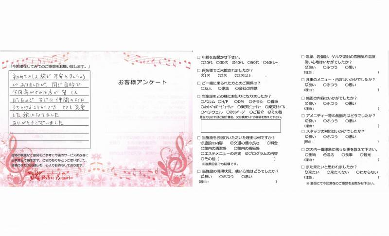 初めての1人旅で不安と緊張がありましたが 同じ目的で今回参加された方が皆1人だった ので、すぐに仲間のようにうちとけることが でき、とても充実した旅になりました。 ありがとうございました。